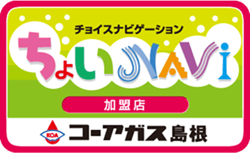 ガス代お支払いなどの対象となるお取り引きをポイント化し、そのポイントに応じてちょいNAVi加盟店で自由に使える金券として会員様へ還元するコーアガス島根〈独自〉のお得なサービスです。また、会員に配布するメンバーズカードを提示することで、ちょいNAVi加盟店で各種サービスもご利用いただけます。