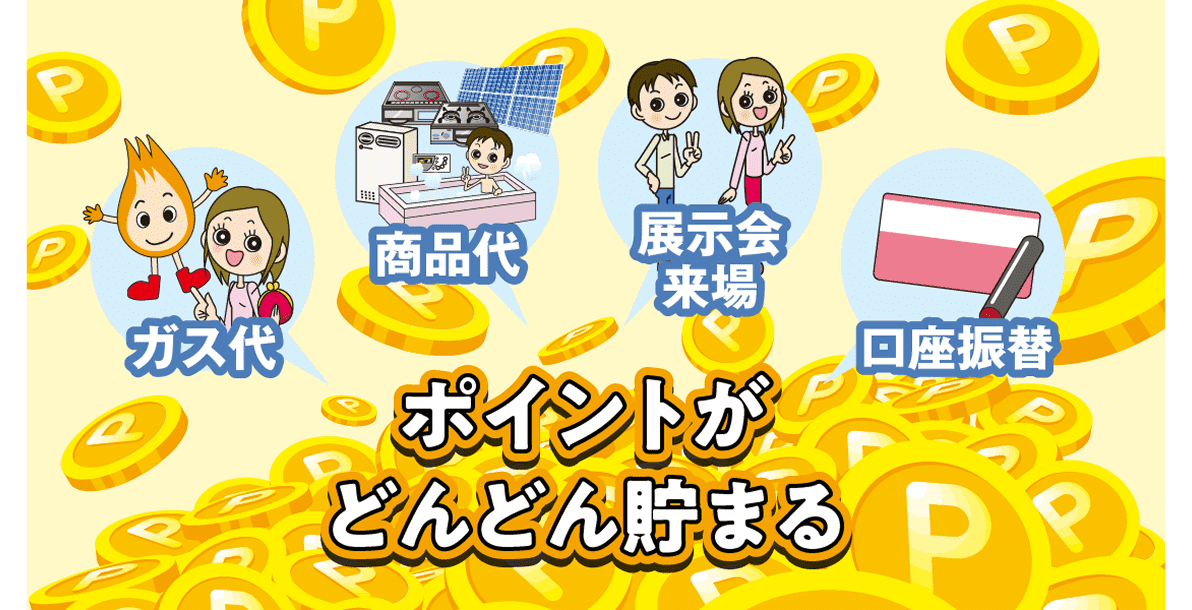 日頃のガス代がポイントとなり、自動的に貯まっていきます。また、商品代金や展示会来場、口座振替などでもポイントを増やすことができます。