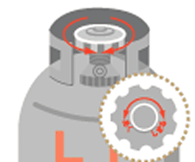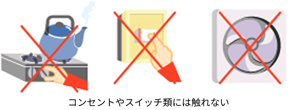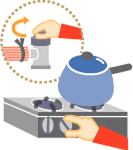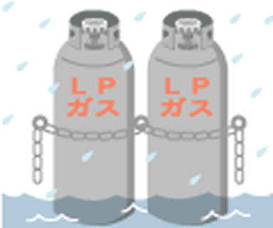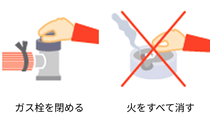 器具栓、ガス栓を閉め、火を全て消します。ゆれが大きいときは、おさまった後で戸外のLPガス容器バルブも閉めてください。