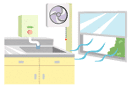 ガス器具使用時は換気扇を回し、ときどき窓を開けて十分に換気してください。小型湯沸器は長時間使わないようにしましょう。不十分な換気は酸素不足や一酸化炭素(CO)の発生につながり危険です。
